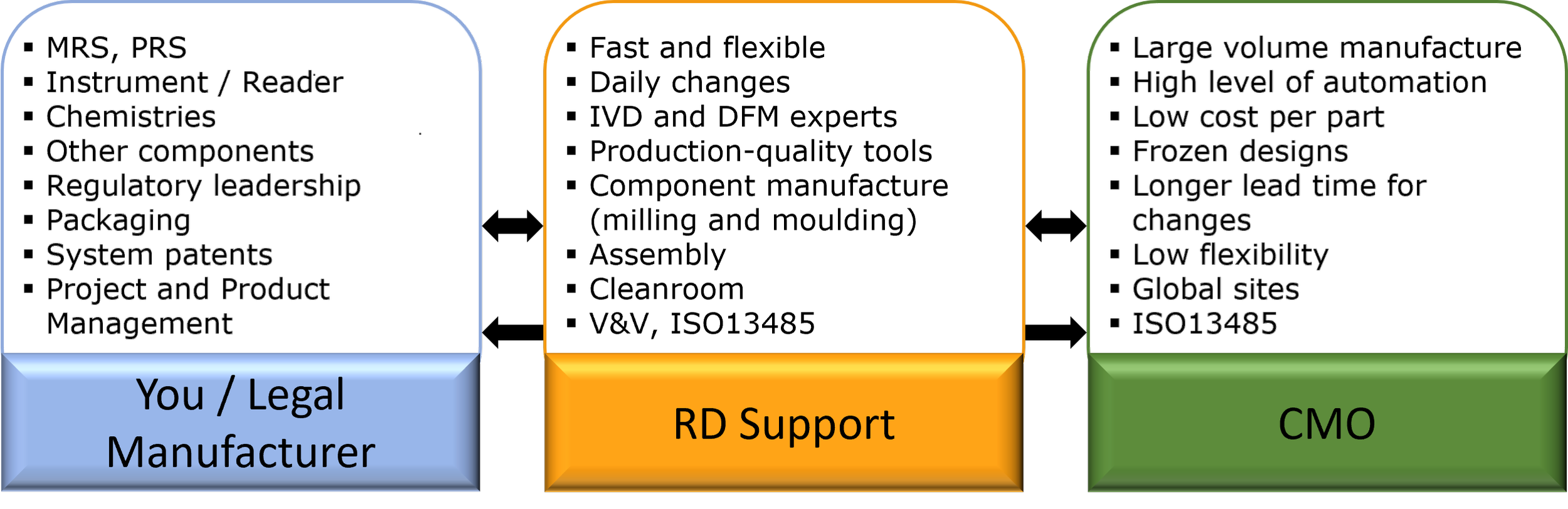 RD Support bridges the gap between innovative diagnostic development and mass production, offering a unique "fast and flexible" manufacturing model. Unlike traditional CMOs focused on high-volume, frozen designs, or legal manufacturers constrained by regulatory requirements, RD Support specializes in rapid iteration with daily changes while maintaining focus on ISO13485 certification.